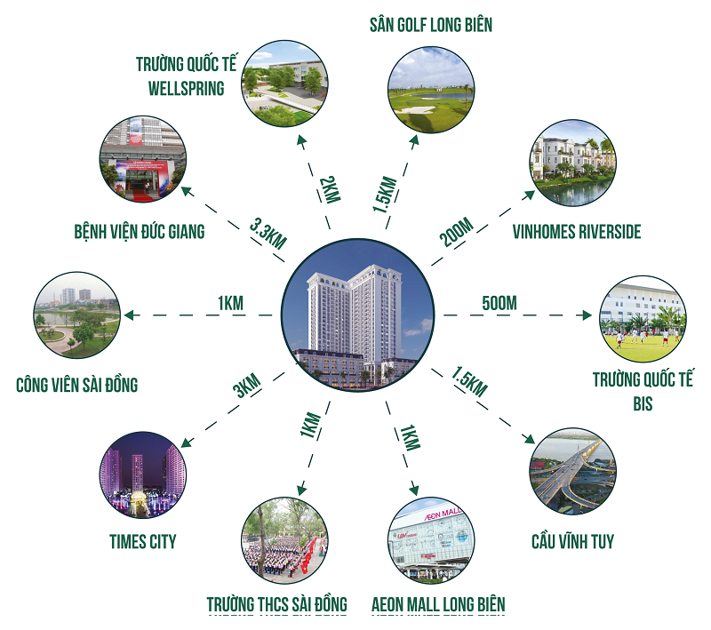 Dự án nằm giữa trung tâm được bao quanh bởi khu dân cư sầm uất, các khu công nghiệp, khu đô thị lớn như Việt Hưng, Vinhomes Riverside, dễ dàng kết nối nhanh với trung tâm thành phố qua 3 cây cầu: Long Biên, Vĩnh Tuy và Thanh Trì. Cơ sở hạ tầng đã hoàn thiện vì vậy khu vực này không chỉ phát triển toàn diện thời điểm hiện tại mà còn phát triển cực kỳ mạnh mẽ, bứt phá trong tương lai gần.